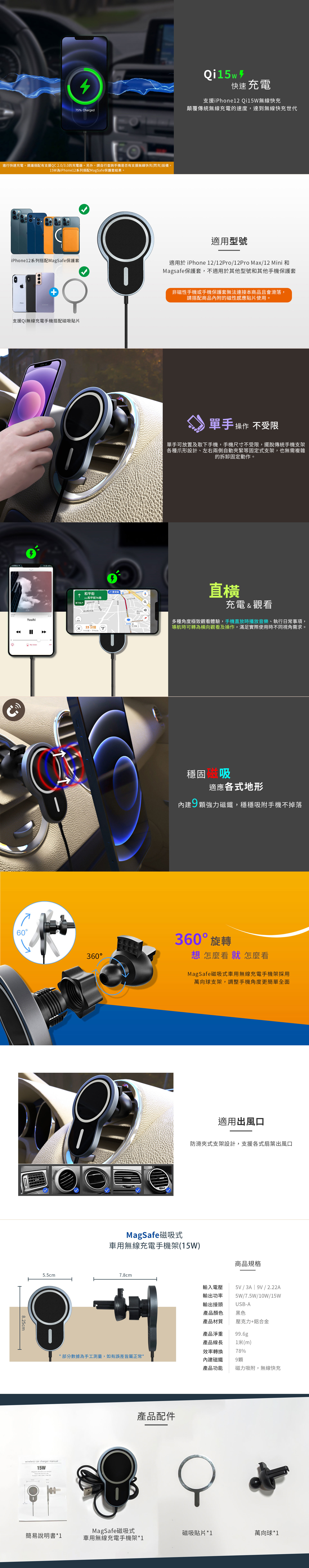 產品名稱:MagSafe磁吸式車用無線充電手機架(15W) (本商品不含充電頭)